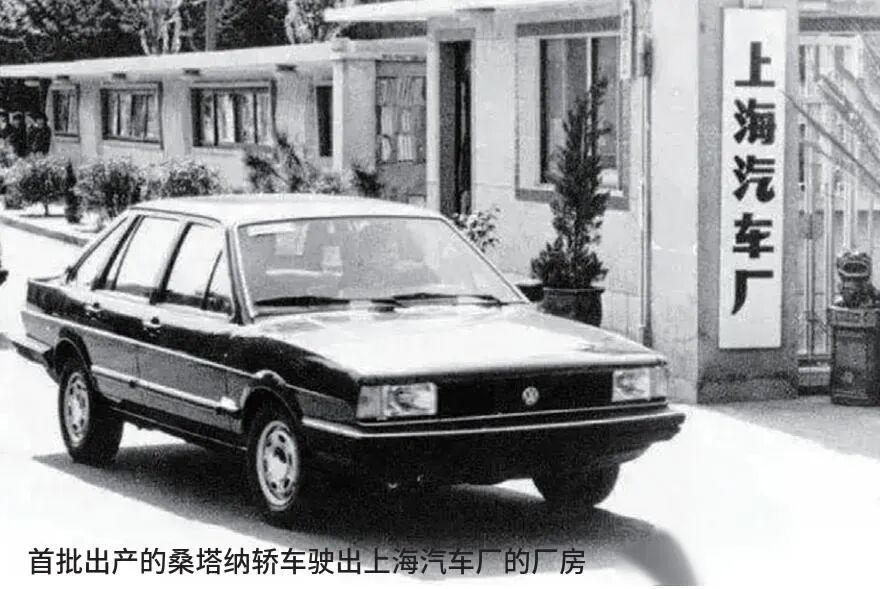 首批出产的桑塔纳轿车驶出上海汽车厂的厂房