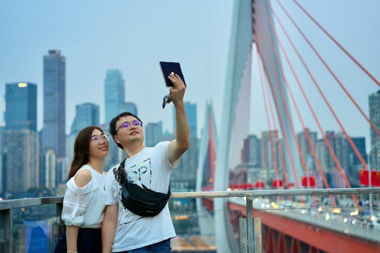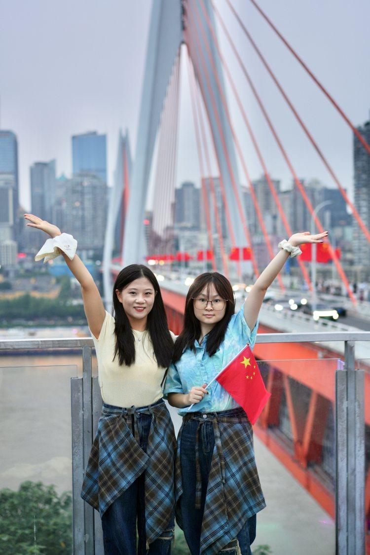 长沙游客张玲利和余宇晴是奔着肖战来的重庆,却没想到着实被他美丽的家乡震撼到了。两个好姐妹挥舞着五星红旗,笑言背后的东水门大桥也是亮丽的红色,“这一抹红色会留在我们的记忆中。”她俩说,白天的大桥很壮观,晚上更浪漫。尤其是站在江边,看着桥的倒影映在江水中,“真是美得让人舍不得离开......”